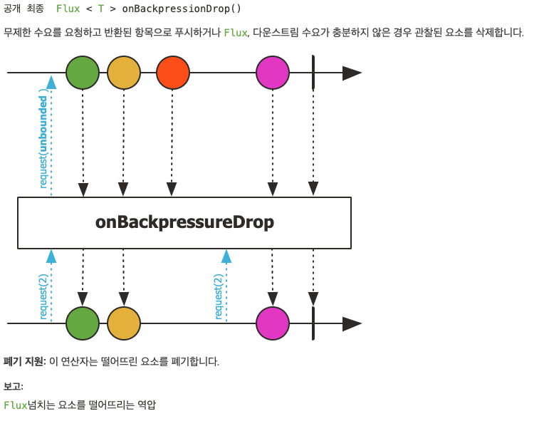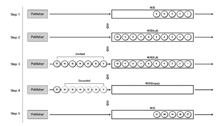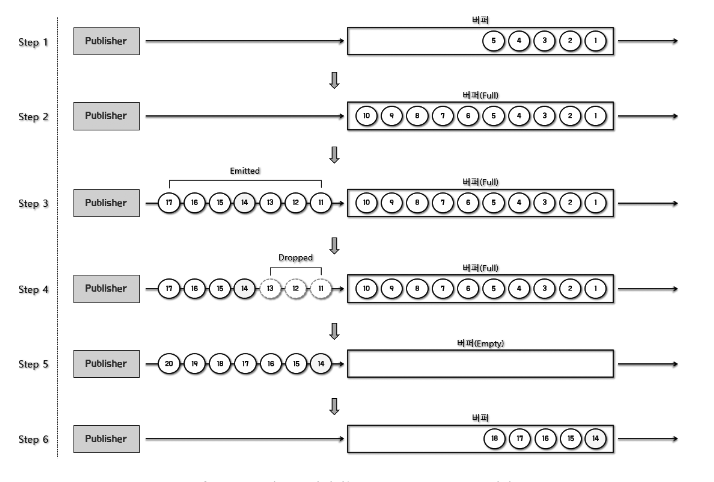 - DROP 전략 : Publisher가 Downstream으로 데이터를 emit 할 때, 버퍼가 가득찰 경우 버퍼 밖에서 대기중인 데이터 중 가장 먼저 emit된 데이터부터 폐기한다.