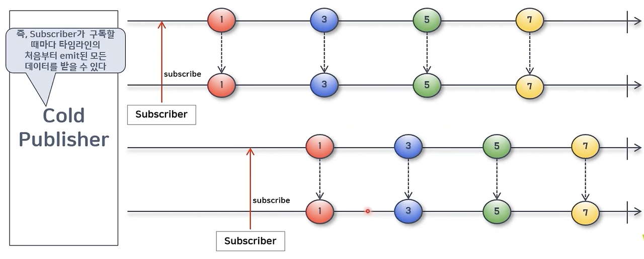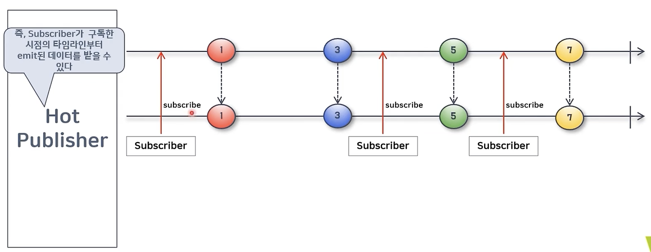 - 구독이 발생한 시점 이전에 Publisher가 emit한 데이터는 Subscriber가 전달받지 못하고 구독이 발생한 시점 이후 데이터만 전달 받을 수 있다. 즉 Subscriber는 구독 시점 이후 Publisher가 emit한 데이터만 전달받는 것이다.즉 타임라인이 하나만 생긴다고 볼 수 있다.