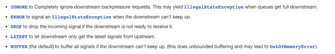 - IGNORE 전략 : Backpressure을 적용하지 않는 전략이다. Subscriber가 처리할 수 있는 데이터 양보다 emit된 데이터의 수가 발행되면 더 많은 데이터를 처리할 수 없다는 신호로 IllegalStateException를 발생시킬 수 있다.