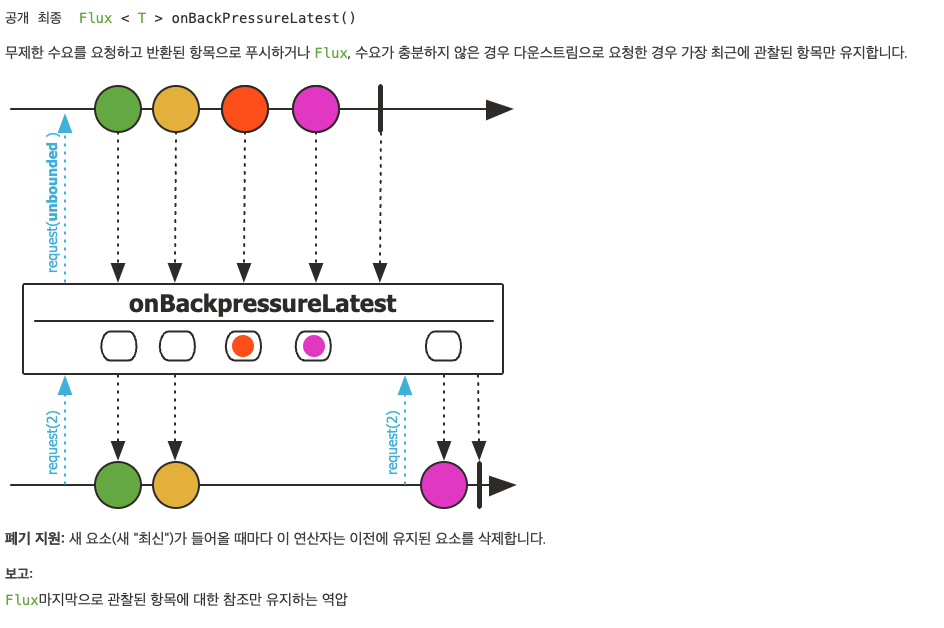 - LATEST 전략 : 버퍼가 가득찰 경우 버퍼 밖에서 대기 중인 데이터 중에서 가장 최근에 emit된 데이터를 버퍼에 채우는 전략이다. DROP과 다른점은 새로운 데이터가 들어오는 시점에 가장 최근의 데이터만 남기고 나머지 데이터는 폐기한다.
