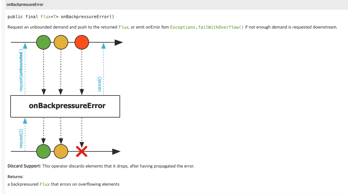 - ERROR 전략 : Downstream의 처리 속도가 emit 되는 데이터 속도보다 느려서 버퍼가 가득 찰 경우 IllegalStateException를 발생시키고 이 때 Publisher는 error signal을 Subscriber에게 전송하고 삭제한 데이터는 폐기한다.