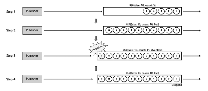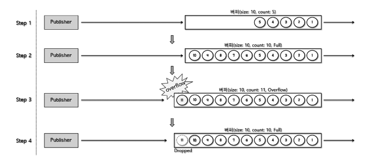 - DROP_OLDEST : 버퍼가 가득 찰 경우 가장 마지막에 버퍼 안에 채워진 데이터를 폐기한다.