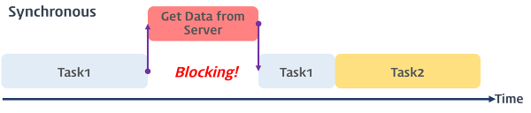 동기식은 직렬적으로 업무를 수행합니다. 즉 요청되는 일을 순차적으로 처리하며 A라는 일을 수행하는 중에 B라는 일이 들어온다면 B는 수행되지 않고 대기합니다. 동기방식을 사용하면 어떤 일에 대한 요청과 결과가 동시에 일어납니다.
