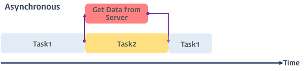 비동기식은 병렬적으로 업무를 수행합니다. 즉 A라는 일을 수행하는 도중에 B라는 일이 들어온다면 A업무가 끝날때까지 대기하지 않고 동시에 B라는 업무를 수행합니다. 비동기방식을 사용하면 어떤 일에 대한 요청과 결과가 동시에 일어나지 않습니다.