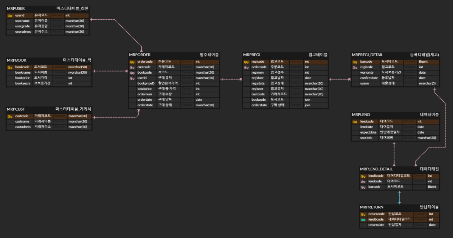 - 도서 구입(발주) -> 도서 입고 -> 도서 등록(바코드 생성)
