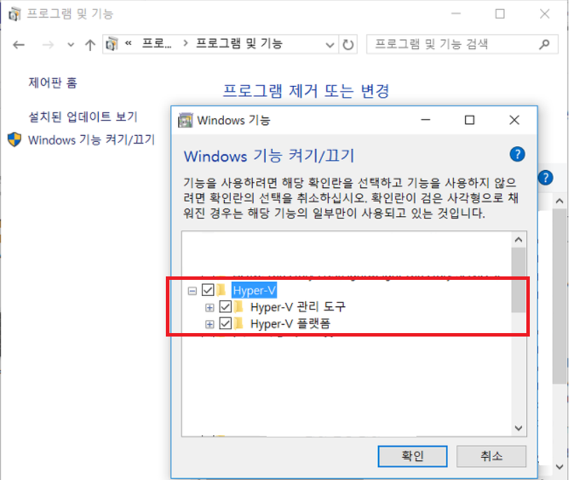 프로그램 제거 또는 변경 -> Windows 기능 켜기/끄기 -> hyper-V 체크
