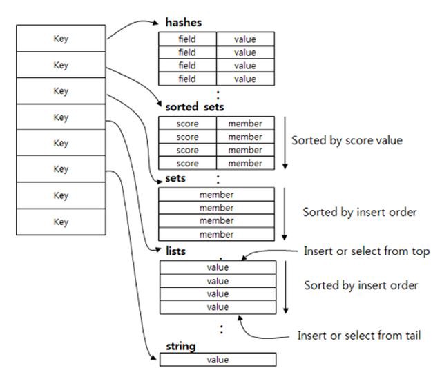 다음의 그림과 같이 문자열, 리스트, 해시, 셋, 정렬된 셋과 같은 다양한 데이터형을 지원한다.