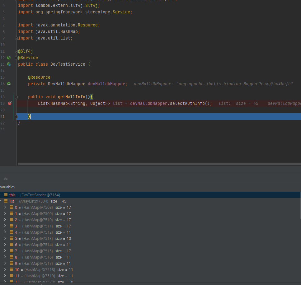 이렇게 작성 후 디버깅모드로 실행해서 list에 SELECT문 실행결과가 잘 담기는지 확인하였다.